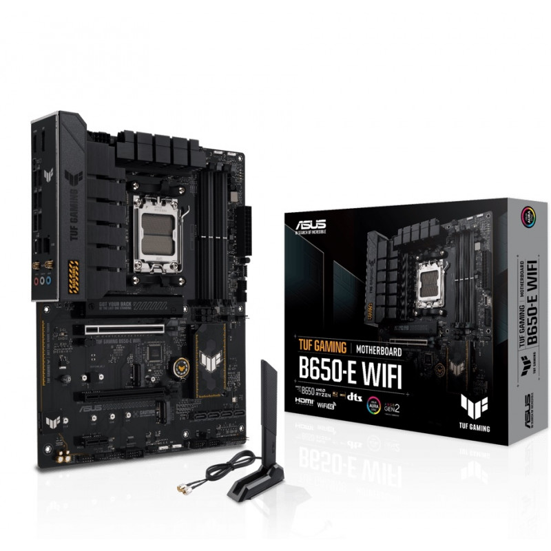 Bygg en kraftfull och framtidssäker dator med ASUS TUF Gaming B650‑E WIFI, ett ATX‑moderkort för AMD AM5‑plattformen. Moderkortet är designat för att ge maximal stabilitet och hållbarhet med militärklassade TUF‑komponenter, robust strömförsörjning och ett omfattande kylsystem som klarar intensiva spel‑ och arbetsbelastningar.